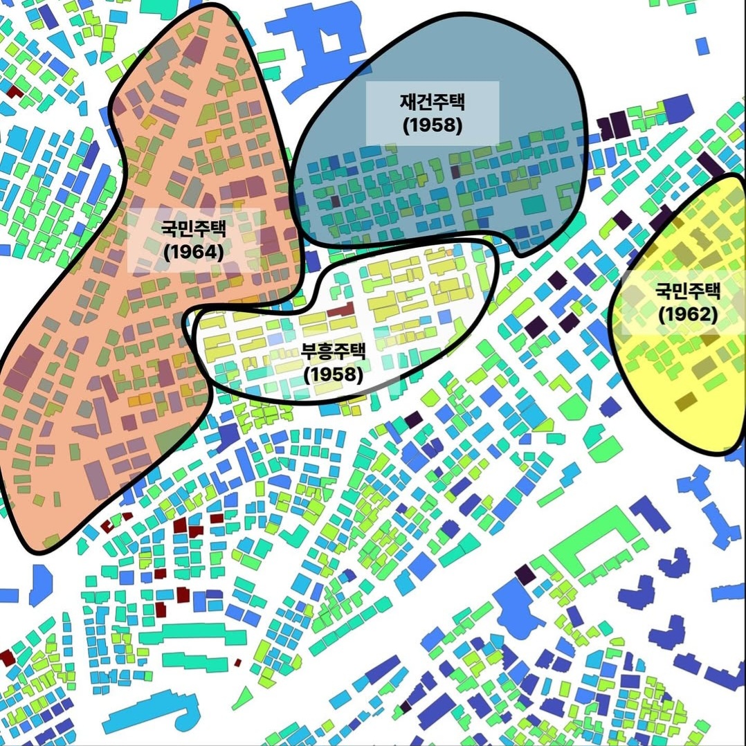 부흥주택의 건설이 있은 후, 장위동에는 1962년과 1964년 두 차례에 걸쳐 국민주택이 대규모로 공급됩니다. 국민주택은 부흥주택과 재건주택의 다음 세대 격으로 정부가 직접 공급한 공영주택단지인데요. 그런 만큼 기존보다 더 넓은 평형과 필지를 가지고 있었습니다.